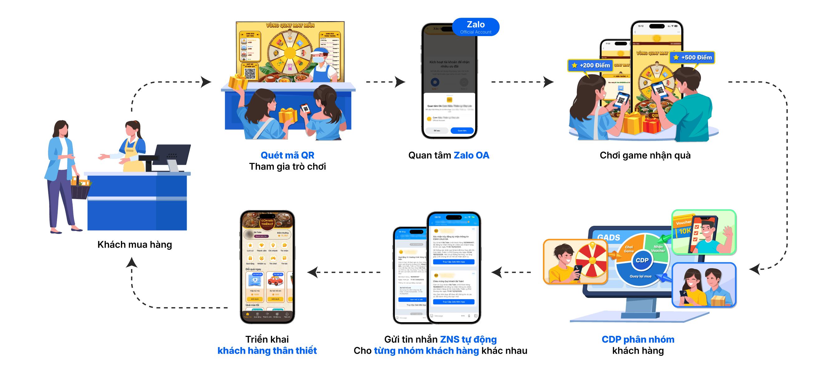 Chúng tôi giúp doanh nghiệp đột phá doanh thu từ khách hàng bằng việc kết hợp Mini Game kích thích tương tác và hệ thống Automation tự động hoá hành trình chăm sóc khách hàng ngay trên Zalo