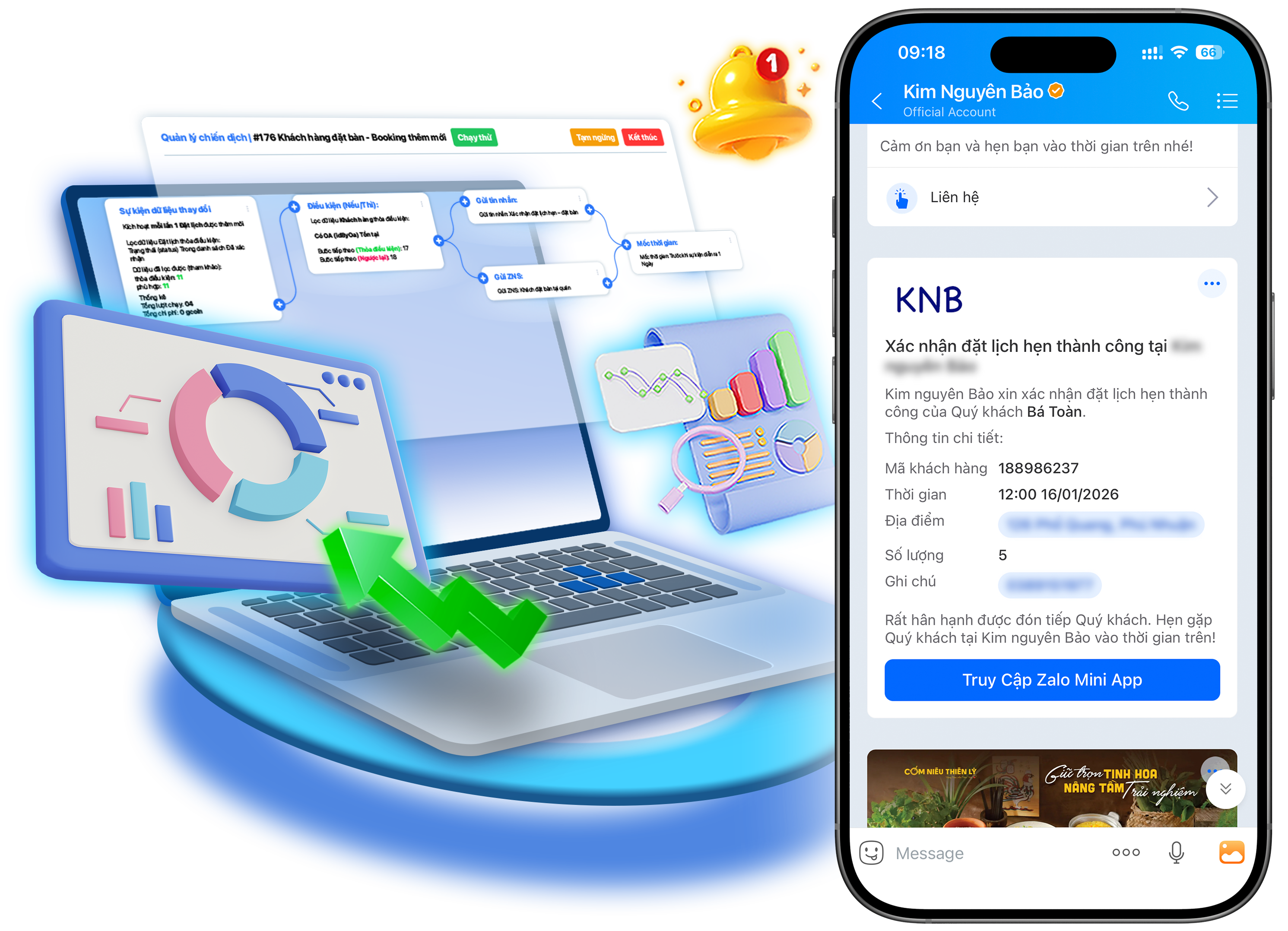 Khách đặt lịch ngay trên Zalo. Hệ thống tự nhắc trước lịch hẹn để giảm bỏ lịch.