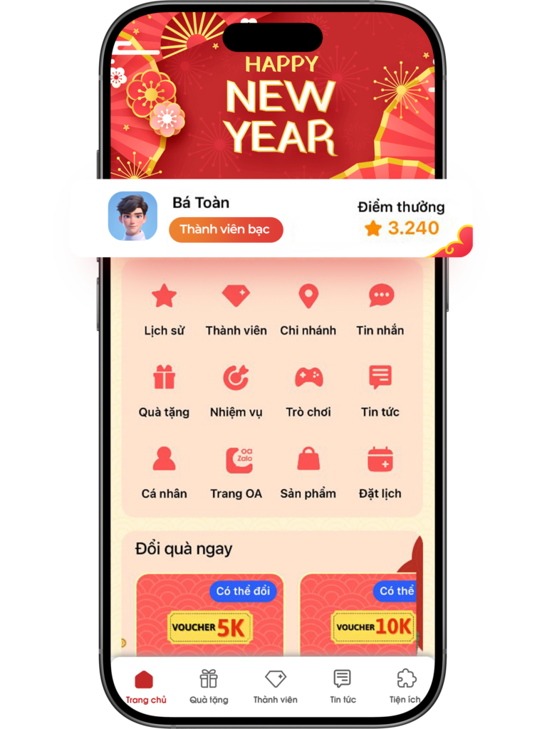 Mang đến trải nghiệm giải trí và tương tác ngay trong Zalo Mini App: phát lì xì may mắn, trò chơi tìm số nhanh tay, vòng quay trúng thưởng, lật thẻ bí mật, quiz vui nhộn, đua top điểm số… Mỗi lần tham gia là một cơ hội nhận quà, tích điểm và gắn kết hơn với thương hiệu. Khách hàng không cần tải thêm ứng dụng, chỉ cần Zalo là đủ để chơi và nhận thưởng.